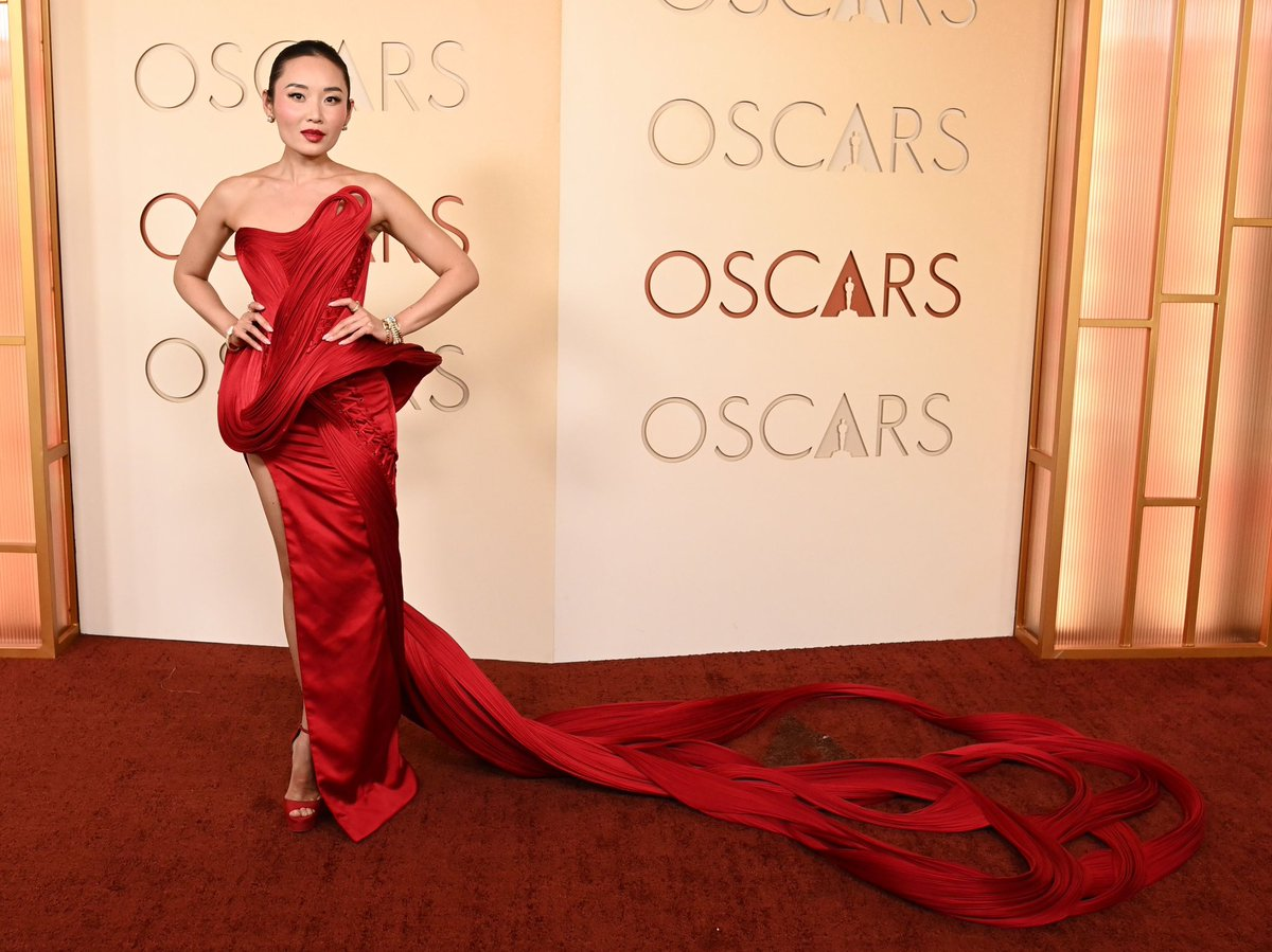 Last year’s best actress, Mikey Madison decidiu honrar o momento com um vermelho na versão mais dramática possível: um vinho profundo, com brilho suave e energia total de “diva de cinema clássico”.