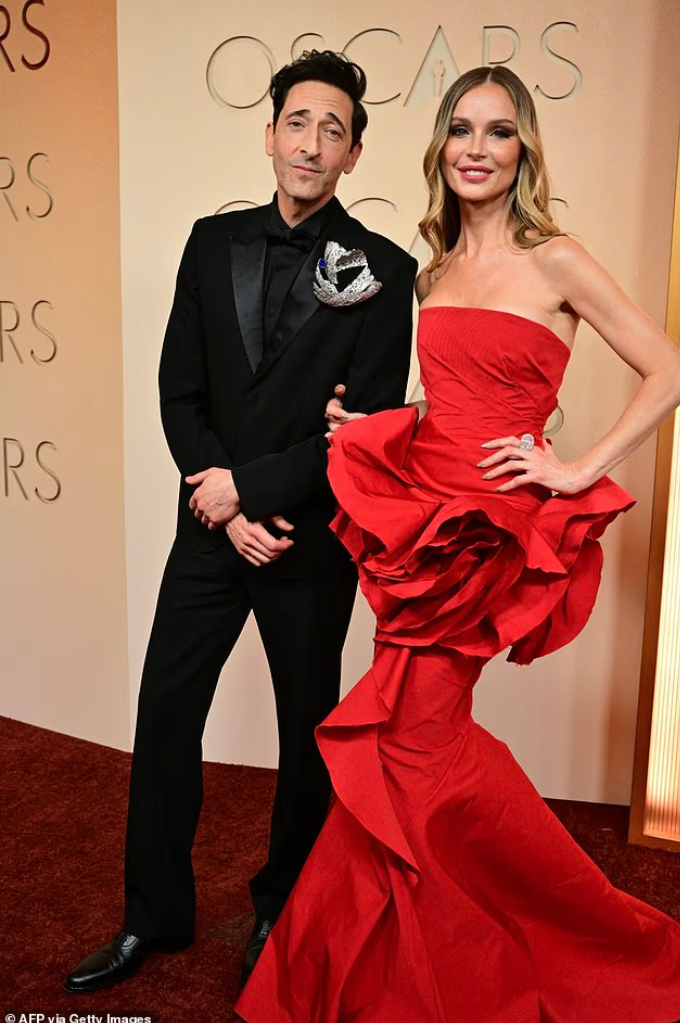 Ao lado de Adrien Brody, Georgina Chapman entregou um dos vestidos mais românticos e dramáticos da noite.