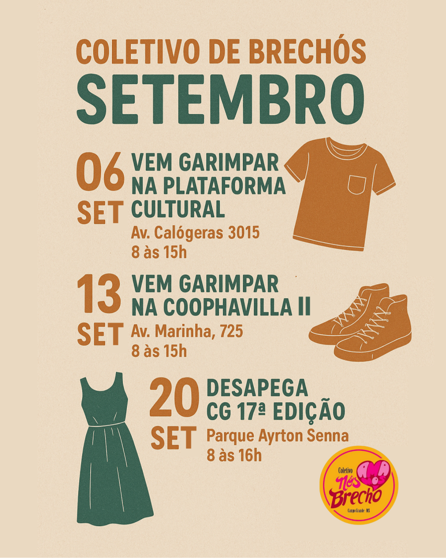 Neste sábado, 13 de setembro, a cidade recebe a primeira edição do “Vem Garimpar no Seu Bairro”, iniciativa do Coletivo de Brechós, que promete movimentar a região da Coophavilla II com muita moda, criatividade e sustentabilidade.
